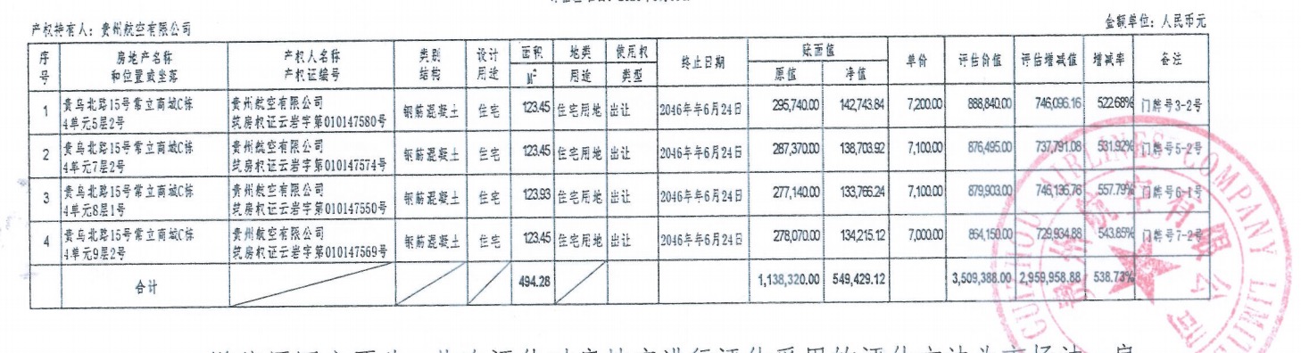 資產(chǎn)公告信息 | 資產(chǎn)描述 | 本次標(biāo)的為貴州航空有限公司持有的貴州省貴陽市貴烏北路15號常立商城四套住宅: 貴州省貴陽市貴烏北路15號常立商城4單元5層2號,建筑面積123.45(㎡),總價888840(元) 貴州省貴陽市貴烏北路15號常立商城4單元7層2號,建筑面積123.45(㎡),總價876495(元); 貴州省貴陽市貴烏北路15號常立商城4單元8層1號,建筑面積123.93(㎡),總價879903(元); 貴州省貴陽市貴烏北路15號常立商城4單元9層2號,建筑面積123.45(㎡),總價864150(元)。 | |||||