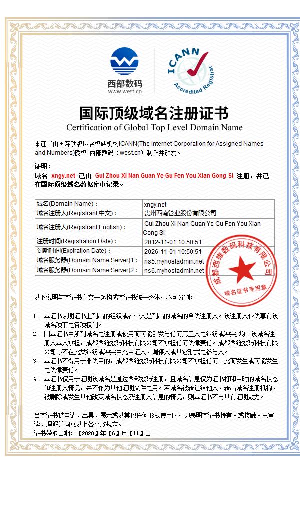 權屬證明 | 證書由國際頂級域名權威機構ICANN(The InternetCorporationforAssignedNamesandNumbers)授權 西部數(shù)碼(westcn)制作并頒發(fā)。 | |||||||