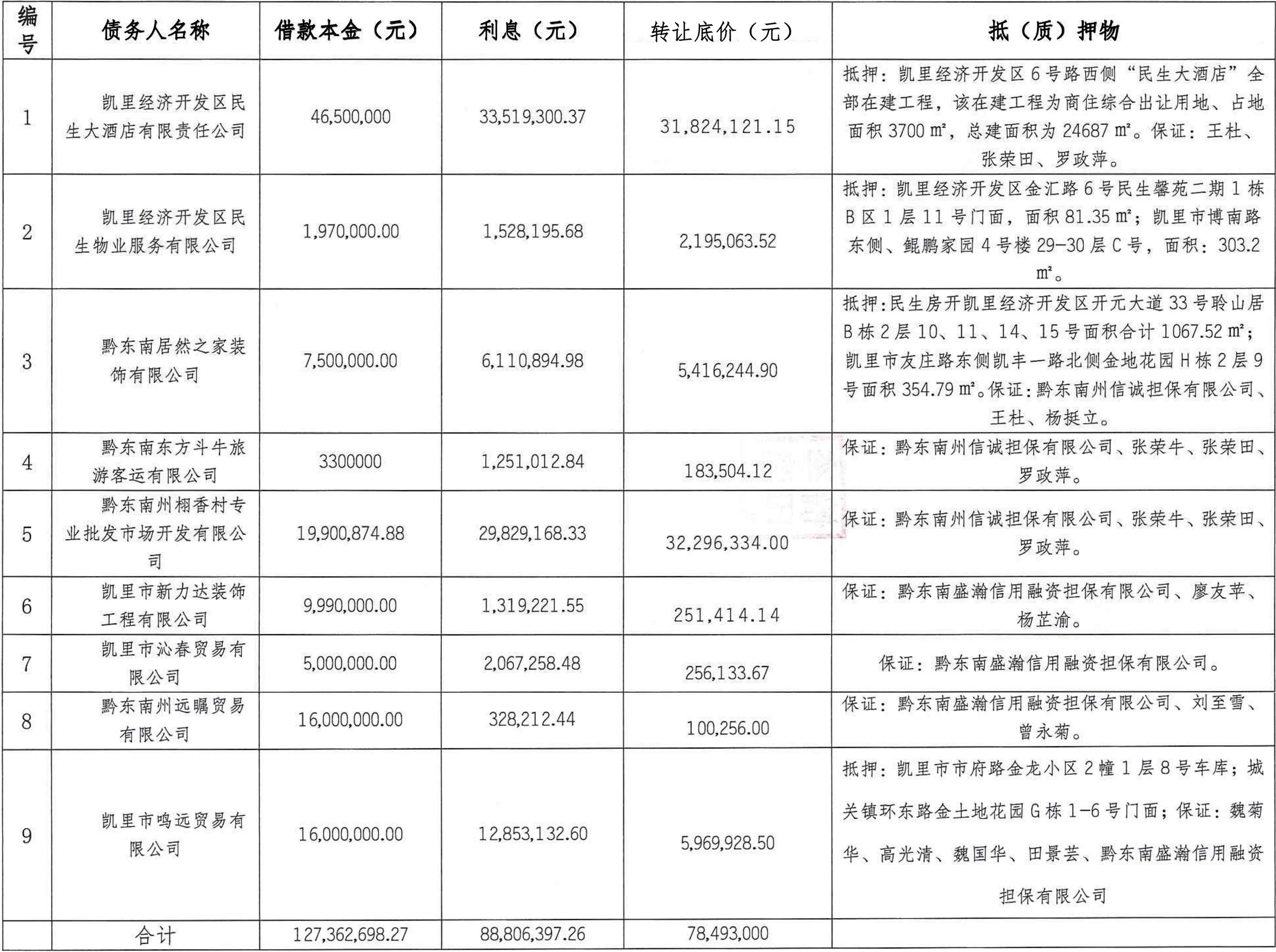 凱里經(jīng)濟(jì)開(kāi)發(fā)區(qū)民生大酒店有限責(zé)任公司等 9 戶(hù)債權(quán)資產(chǎn)包整體轉(zhuǎn)讓
